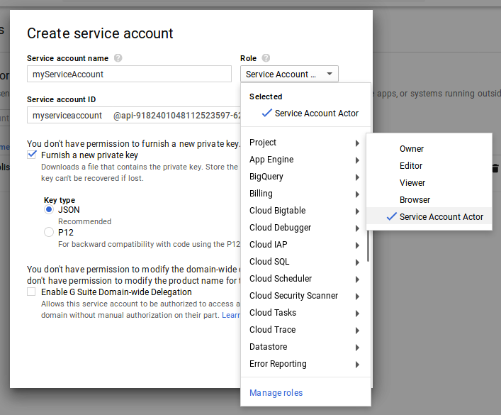 On Google API Console page, click the button on top named Create Service Account. Set the service account name and select the role as Service Account Actor which can be found under Project section in Role dropdown. Make sure to tick the checkbox Furnish a new private key and select JSON as key type. After all this, clicking on CREATE button will create this service account and download a json file which will contain service account details. Keep this json file somewhere safe as it would be required for authenticating with Google Play Access API later on.