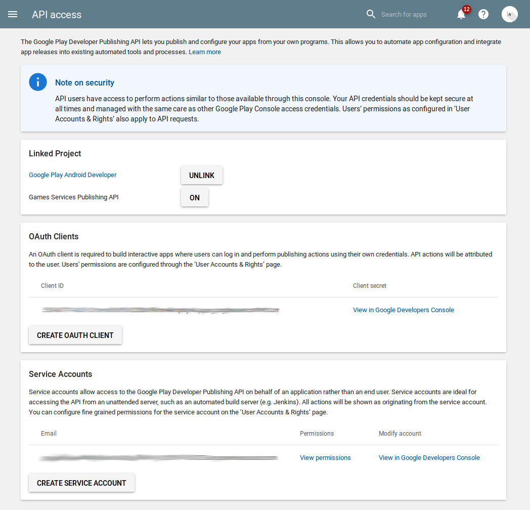 This will create a service account for your Google Play Developer Account. Make sure to check the API Access page again to make sure that the created service account is appearing on that page.