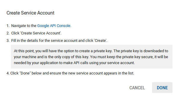 After linking the account, create a OAuth Client and Service Account. Creating OAuth Client is very easy, just click on CREATE OAUTH CLIENT button and it will create an OAuth Client. And, for Service Account, after clicking on CREATE SERVICE ACCOUNT, it will show a dialog indicating that you need to visit Google API Console page and manually create a service account.